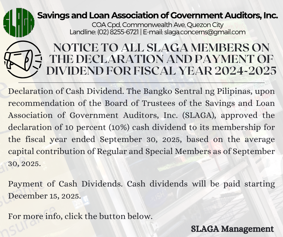 SLAGA is exclusive to COA officials and regular employees, both active and retired and SLAGA employees.